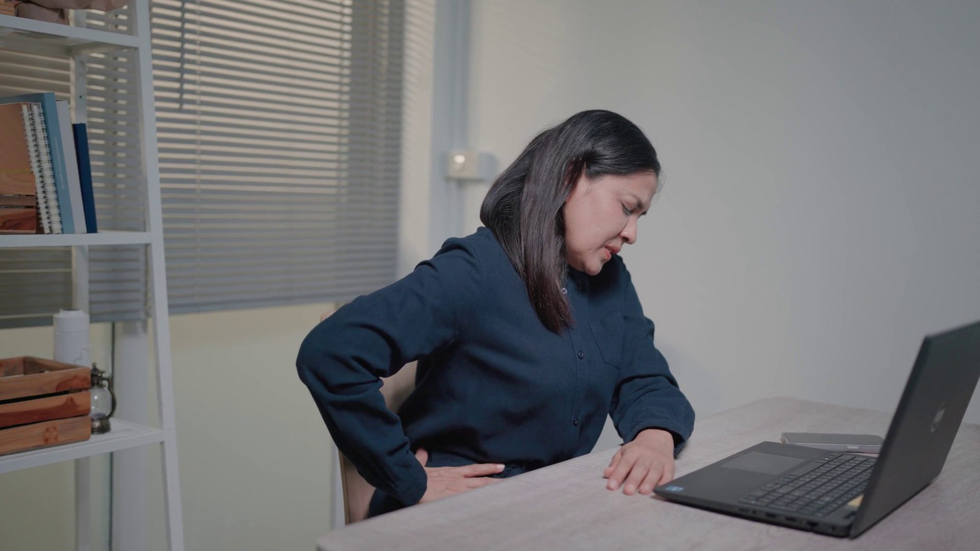 Middle Aged Woman Suffering From Stomach Ache While Working On LaptopÂ