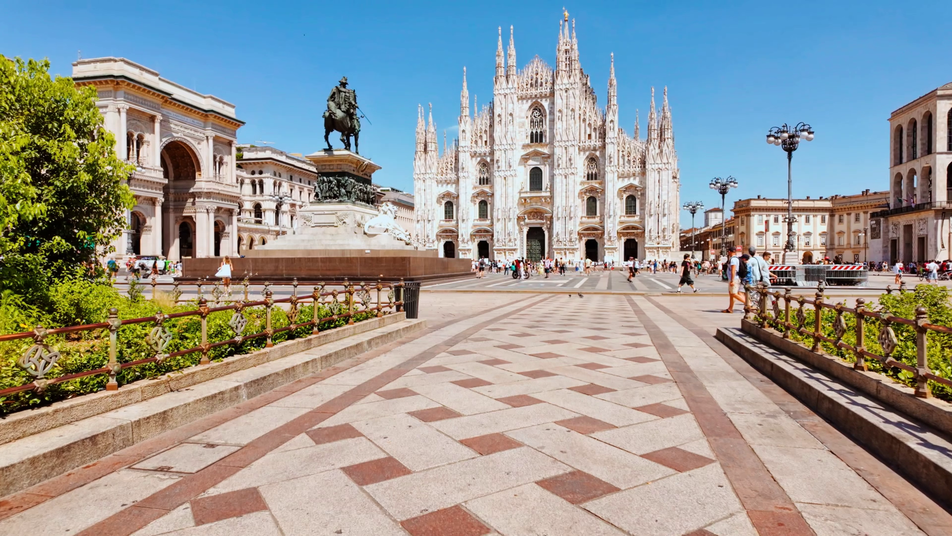 Milan Italy 16 July 2024 Tourists Strolling On Sunlit Paving Stones Before The Towering Gothic Facade Of The Duomo Di Milano Milan Lombardy ItalyÂ