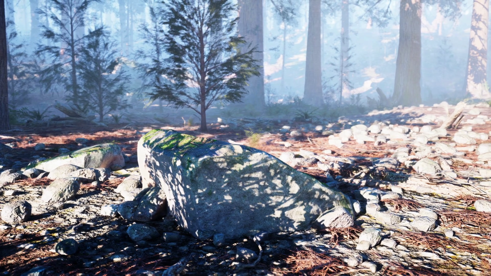 Misty Canadian Forest With Rocks And Lush Foliage In Morning Light