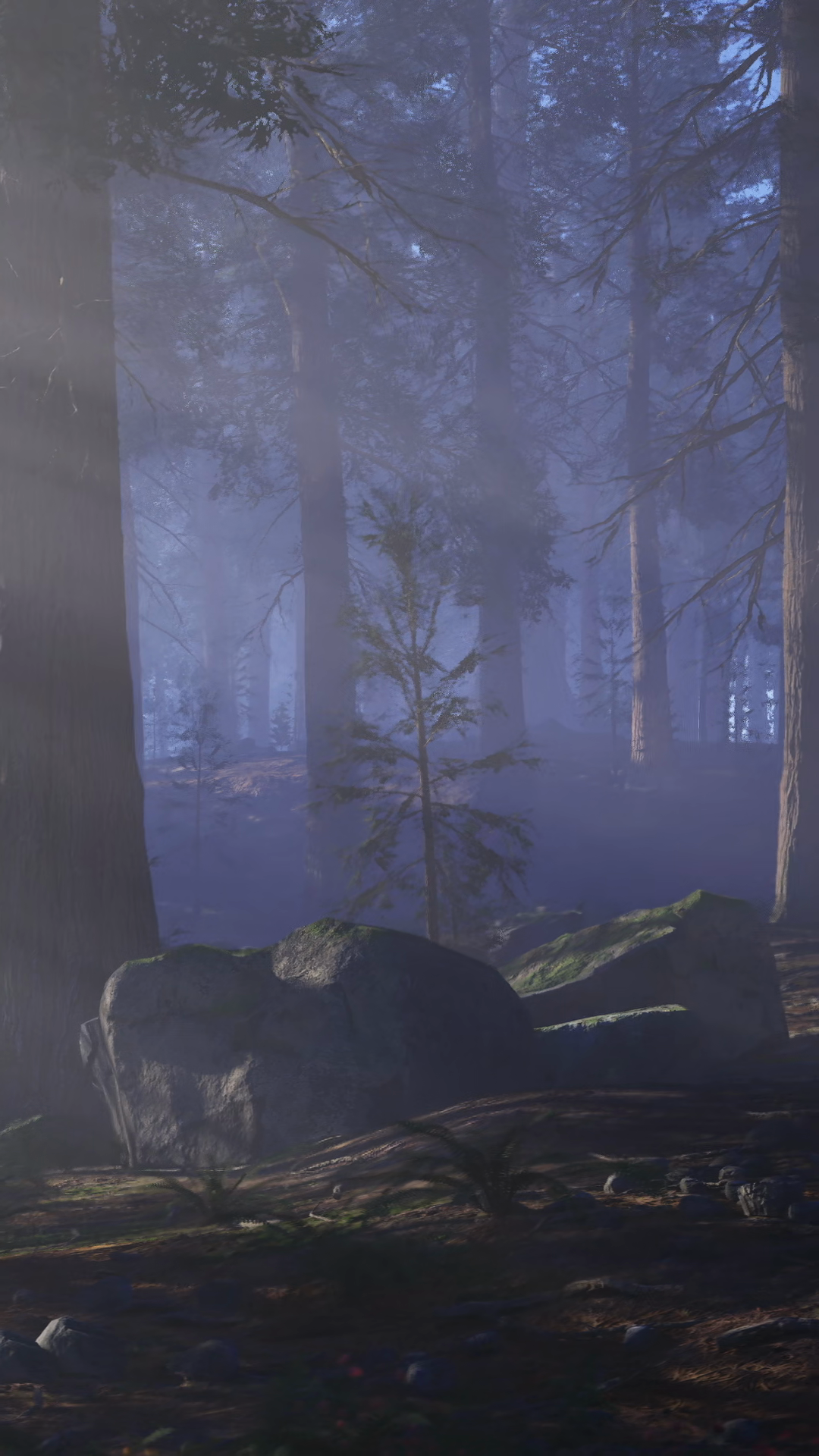 Misty Forest Scene With Trees And Rocks During Early Morning LightÂ