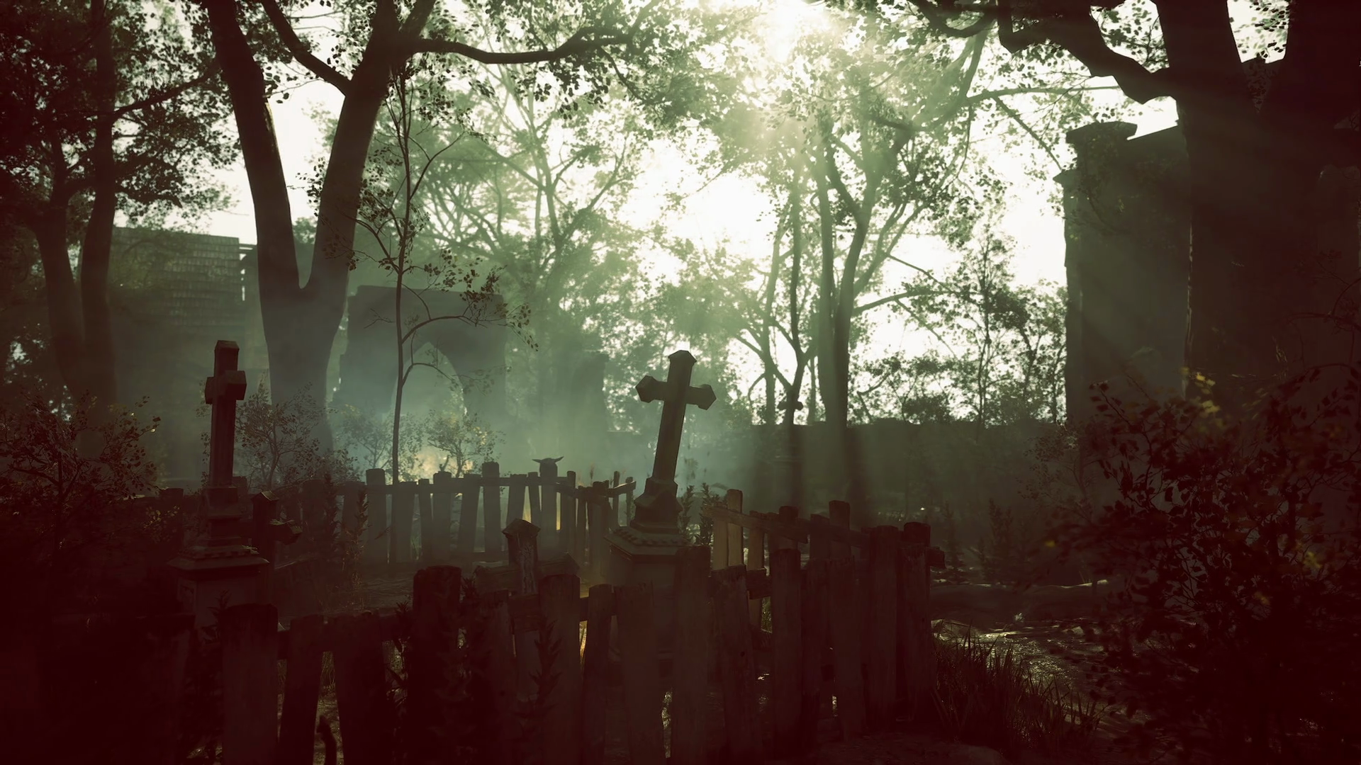 Misty Graveyard At Dawn With Radiant Sunlight Filtering Through Trees