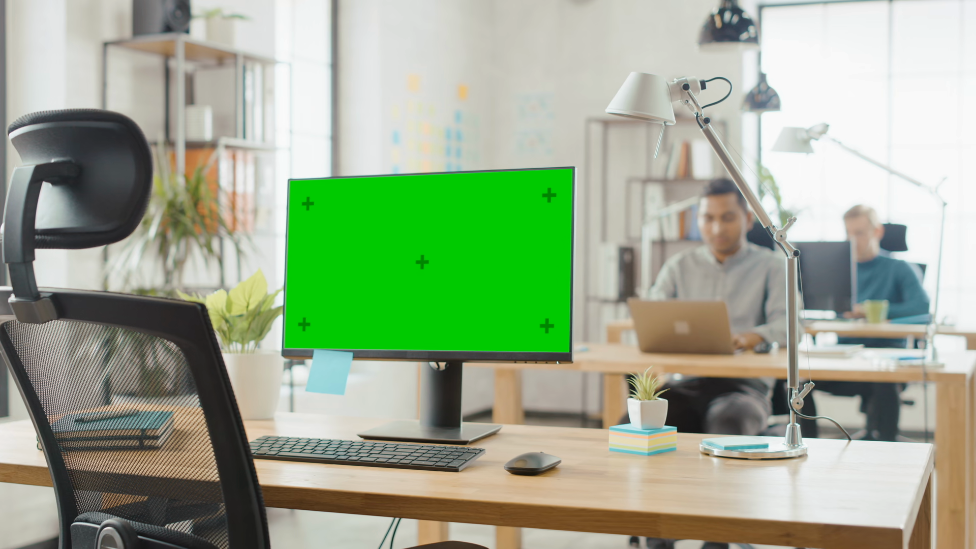 Mockup Screen Desktop Computer Standing On The Desk In The Modern Creative Office In The Background Bright Studio Where Diverse Team Of Young Professionals Work On ComputersÂ
