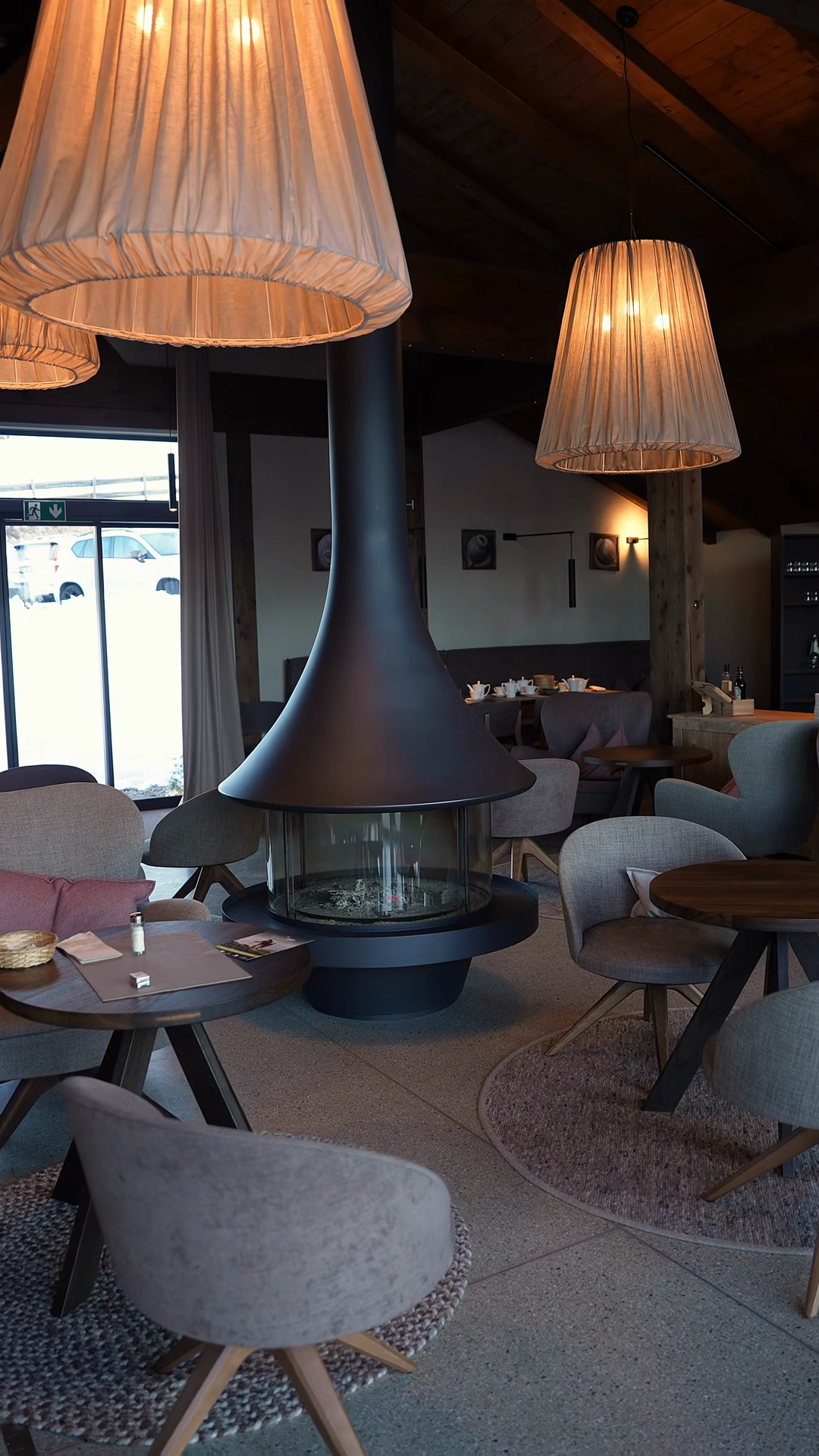 Modern Alpine Hotel Lounge With Cone Fireplace Glass Hearth Pendant Lamps Grey Chairs Wood Tables And Tea Service Snow And Parked Cars Show Daytime Winter SettingÂ