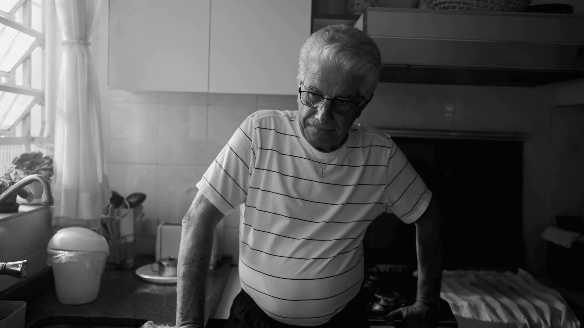 Monochromatic Scene Elderly Man In Deep Remorse Gazing Out Kitchen Window With A Sense Of RegretÂ