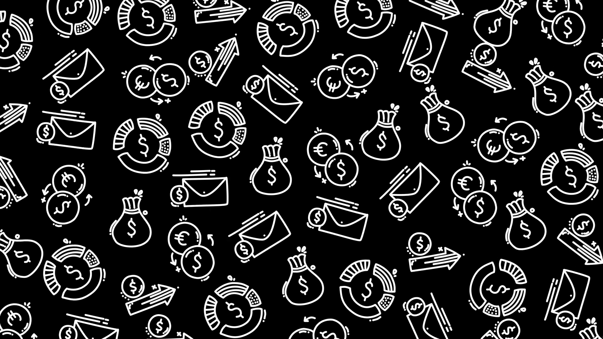 Monochrome Black Background With White Doodle Drawings Of Money Bag Chart Envelope And Arrow Symbol Perfect For Global Business Design Or Economic Event Celebration Illustration