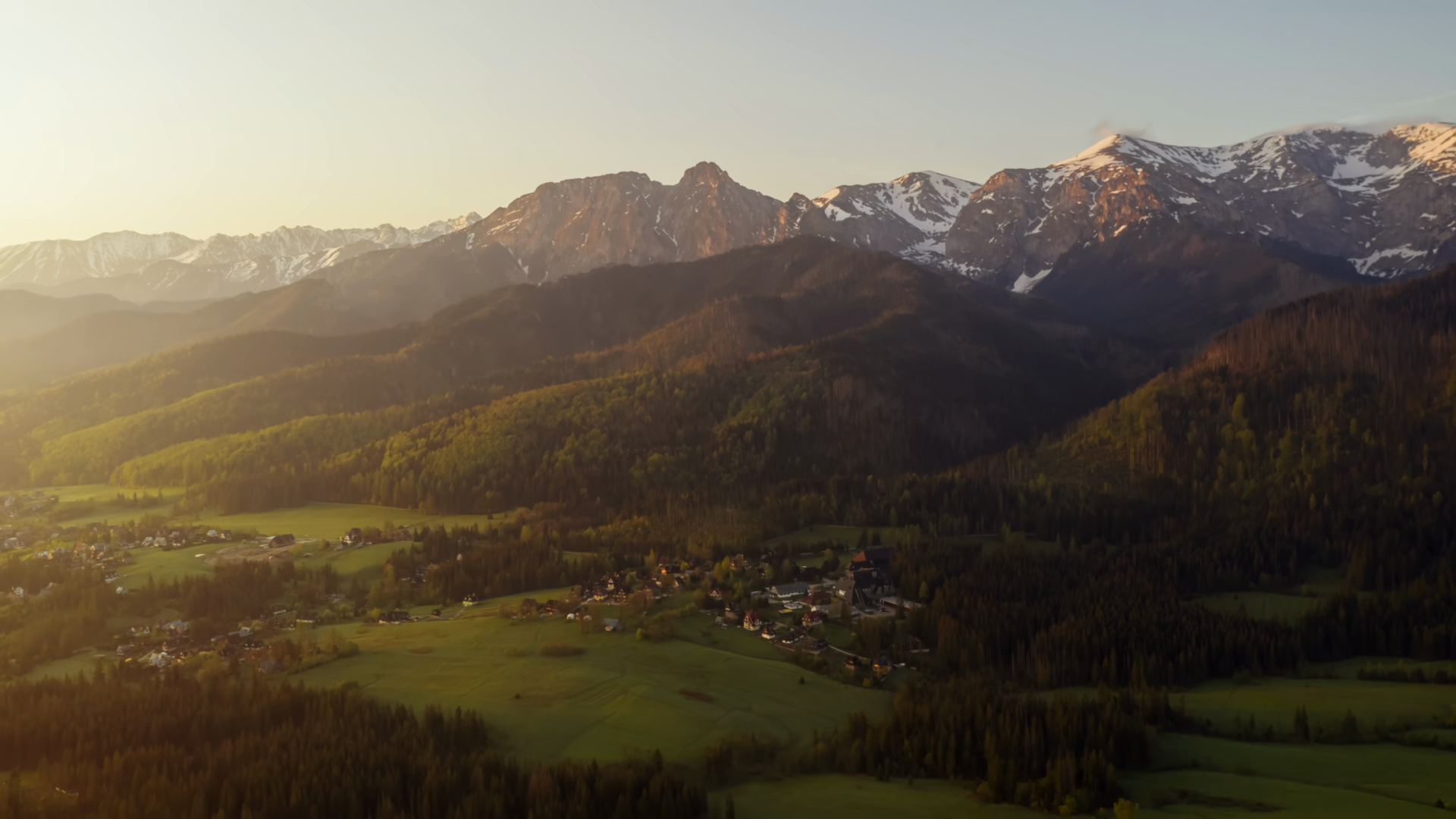 Mountains Aerial Drone Shot Snowy Mountain Peaks Green Hills Covered With Pine Trees Lit With Warm Sunrise Light Epic Mountain Range View From Above Spring Season Early Morning Landscape Golden HourÂ