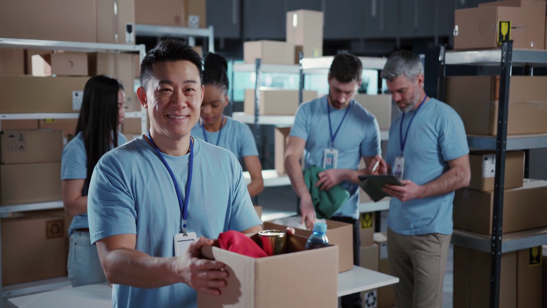 Multiethnic Team Of Volunteers Collaborating In Workshop Chinese Male Adult Worker Collecting Food Supply Free Delivery Box Smiling IntoÂ