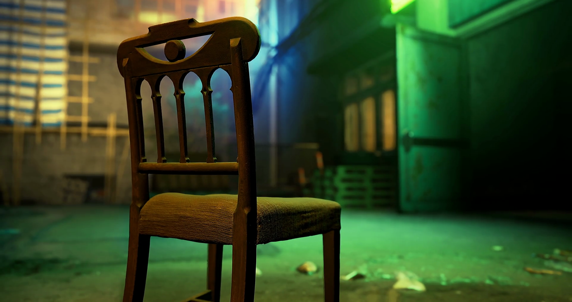 Mysterious Empty Chair Illuminated By Colorful Lights In A Dim Alley