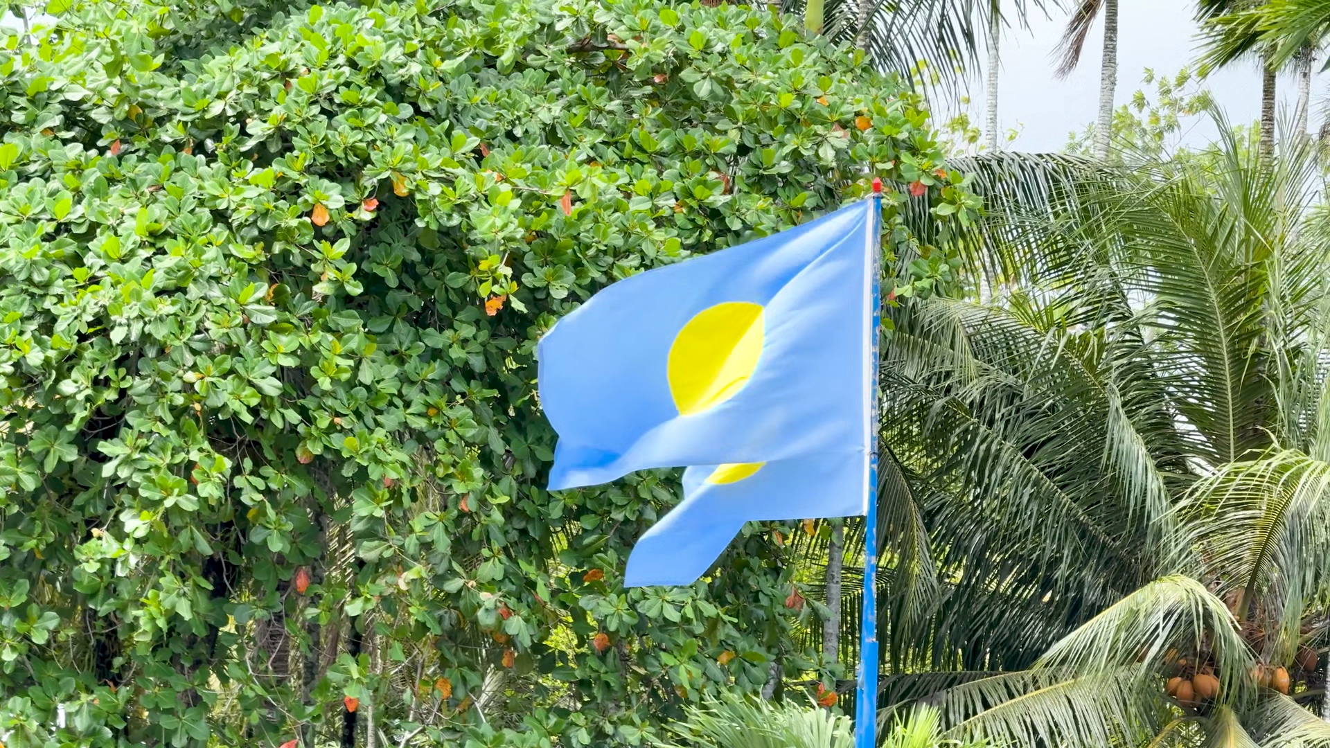 National Flag Of Palau Waving In A Tropical Garden SettingÂ