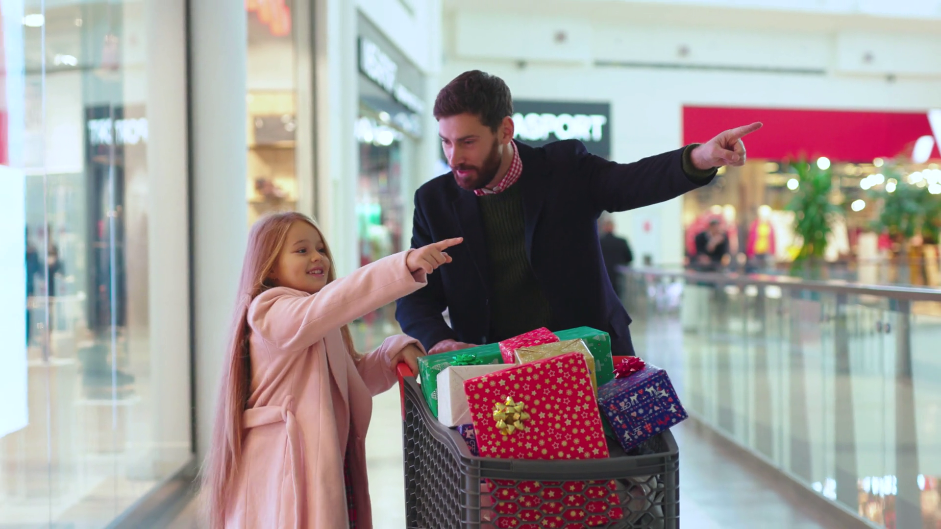 New York April 5 2019 Smiling Father With Daughter Bought Christmas Present Boxes Gifts In Cart On Shopping Center Talk Dad Child ShopÂ