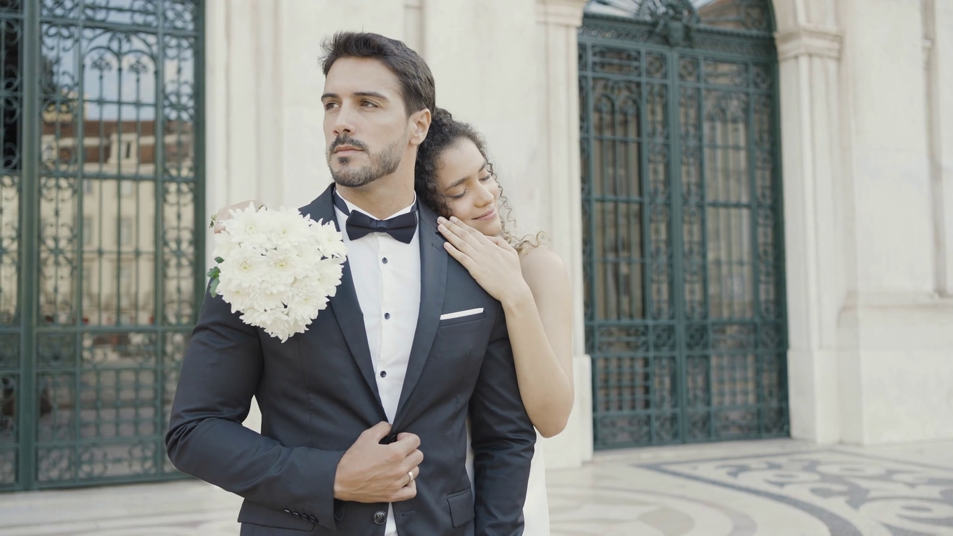 Newlyweds Caucasian Bride And Groom Standing Outdoors In The City Street Action Woman In White Dress With White Bouquet Lying On TheÂ
