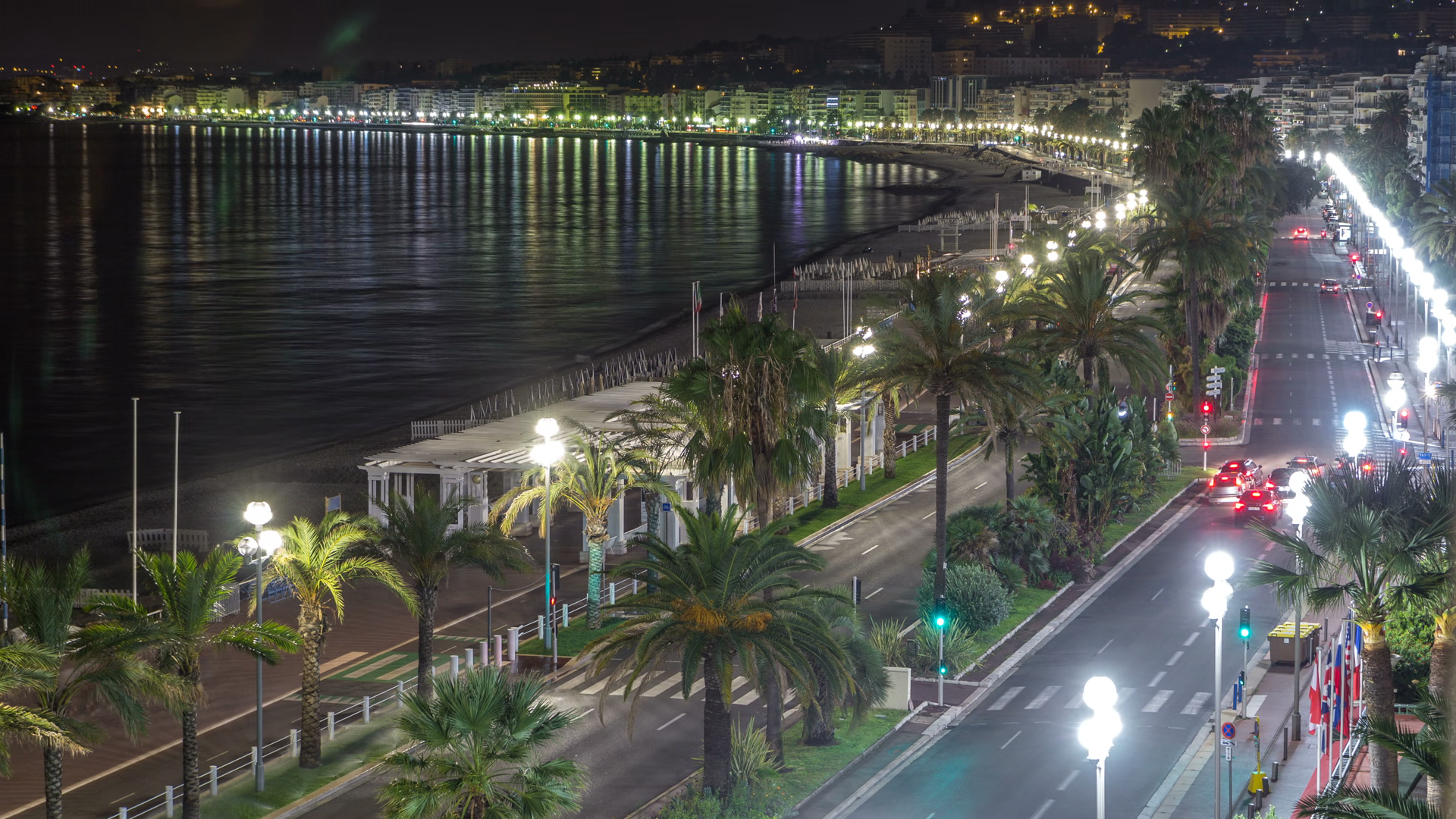 Night Aerial Panorama Of Nice Timelapse France Lighted Old Town Little Streets And Waterfront