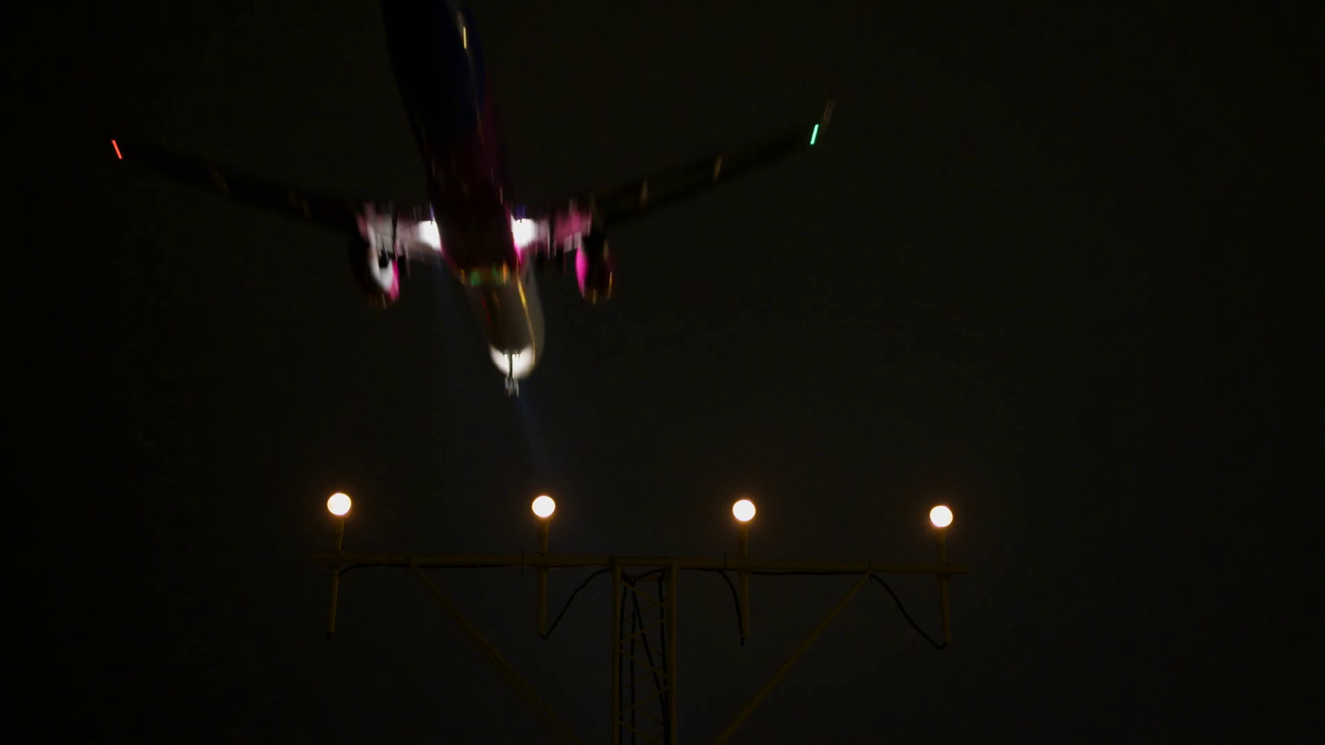 Nighttime Aircraft Descending Toward Runway Navigating With Precision Approach Lighting System Guiding Touchdown Sequence Against DarkÂ