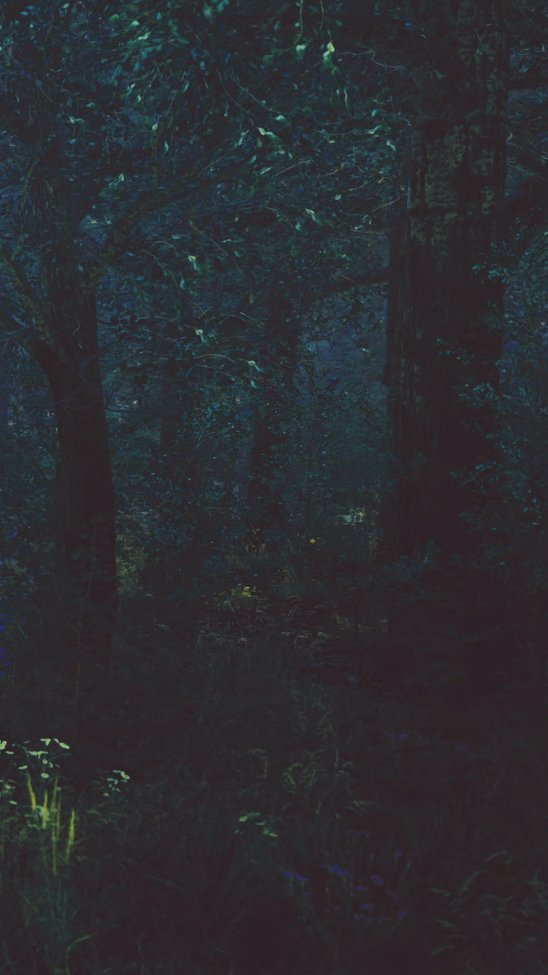 Nighttime Scene In A Dense Forest With Dark Foliage And Distant TreesÂ