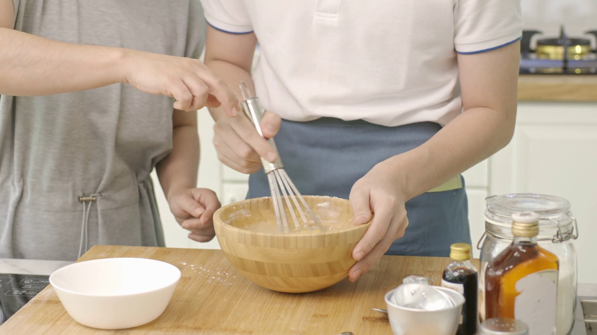 Normal View Of Mother Hands Putting Mix Of Yolks With Her Son Starch Sugar And Milk In Milk For Making Custard Cream At HomeÂ