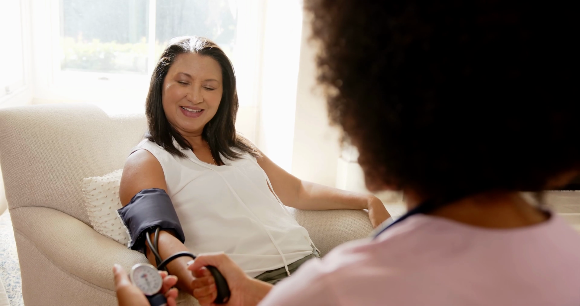 Nurse Checking Blood Pressure Of Smiling Woman Sitting On Couch At HomeÂ