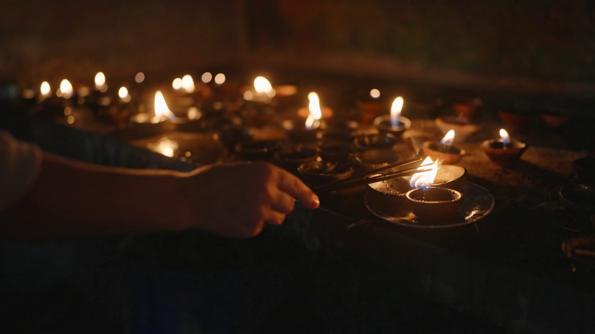 Oil Lamps Flicker In Dim Light At Buddhist Temple Hand Lights Incense As Part Vesak Ritual Tranquil Night Scene Embodies PeaceÂ