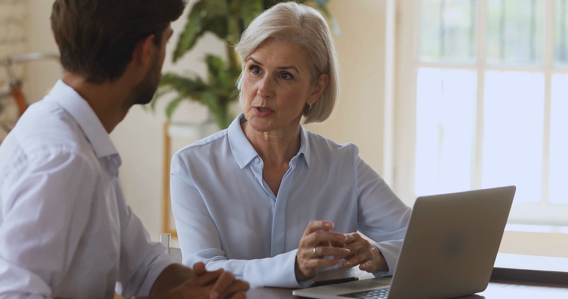 Older Saleswoman Bank Manager Explaining Customer Services BenefitsÂ