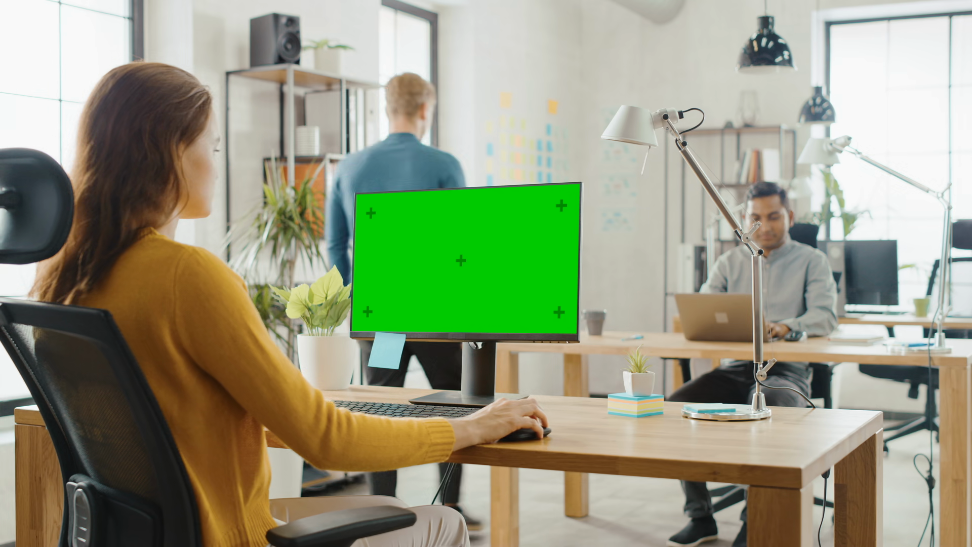Over The Shoulder Creative Young Woman Sitting At Her Desk Using Desktop Computer With Mockup Green Screen In The Background Bright Office Where Diverse Team Of Young Professionals Work On ComputersÂ