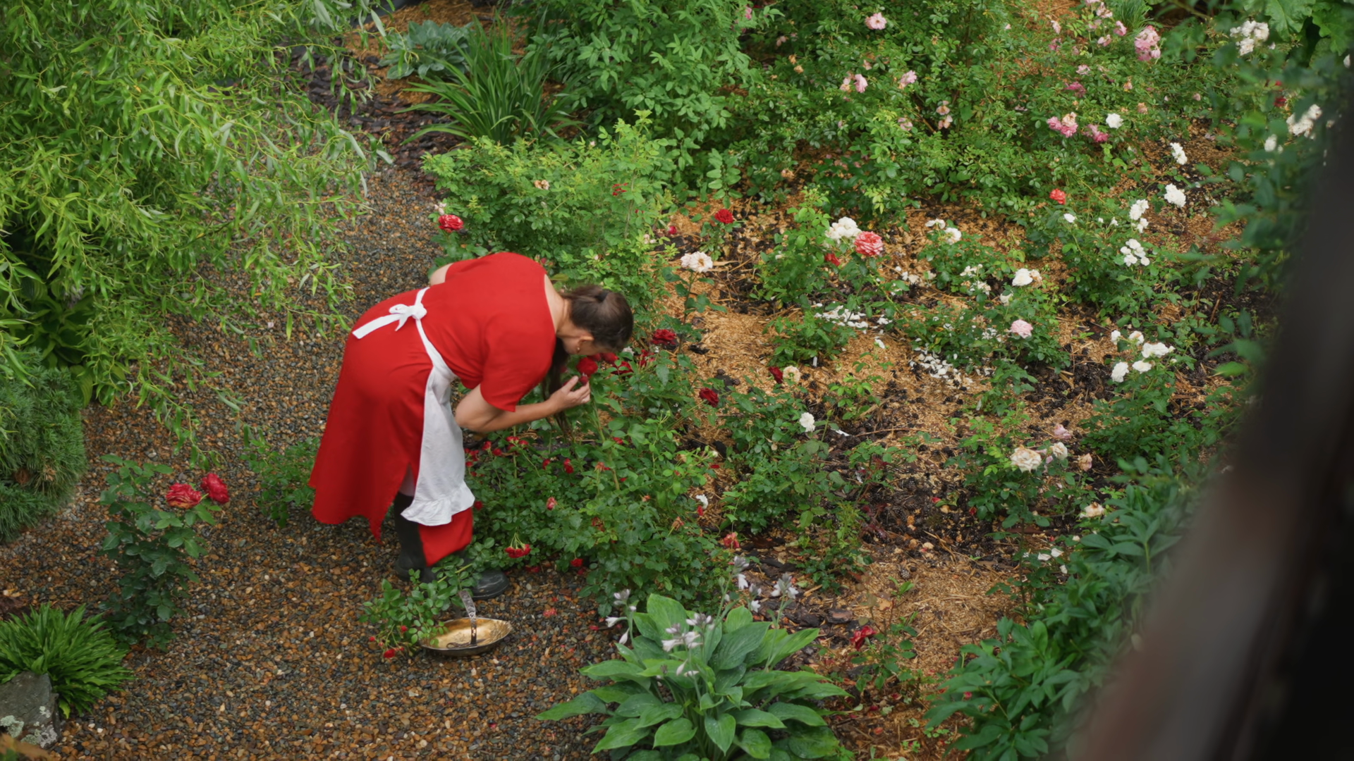 Overhead View Woman Harvesting Roses Into Basket Red Dress And White Apron Careful Bending Along Gravel Path Mixed Flowerbed WithÂ