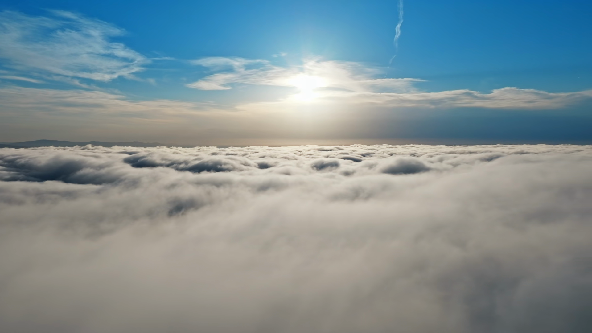 Panoramic Drone Shot Above Clouds Sunset Bright Sun Disk Horizon Blue Sky Background Heavenly Landscape Fluffy White Clouds Golden Hour Light Freedom Inspiration Concept Professional VideoÂ