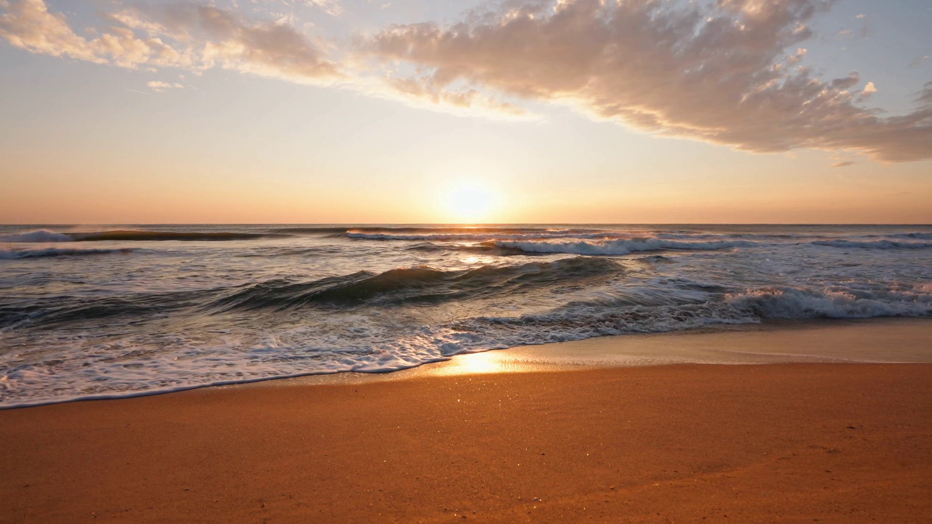 Panoramic View Of Sandy Sea Shore With Waves Illuminated By Golden Light At Sunset Â