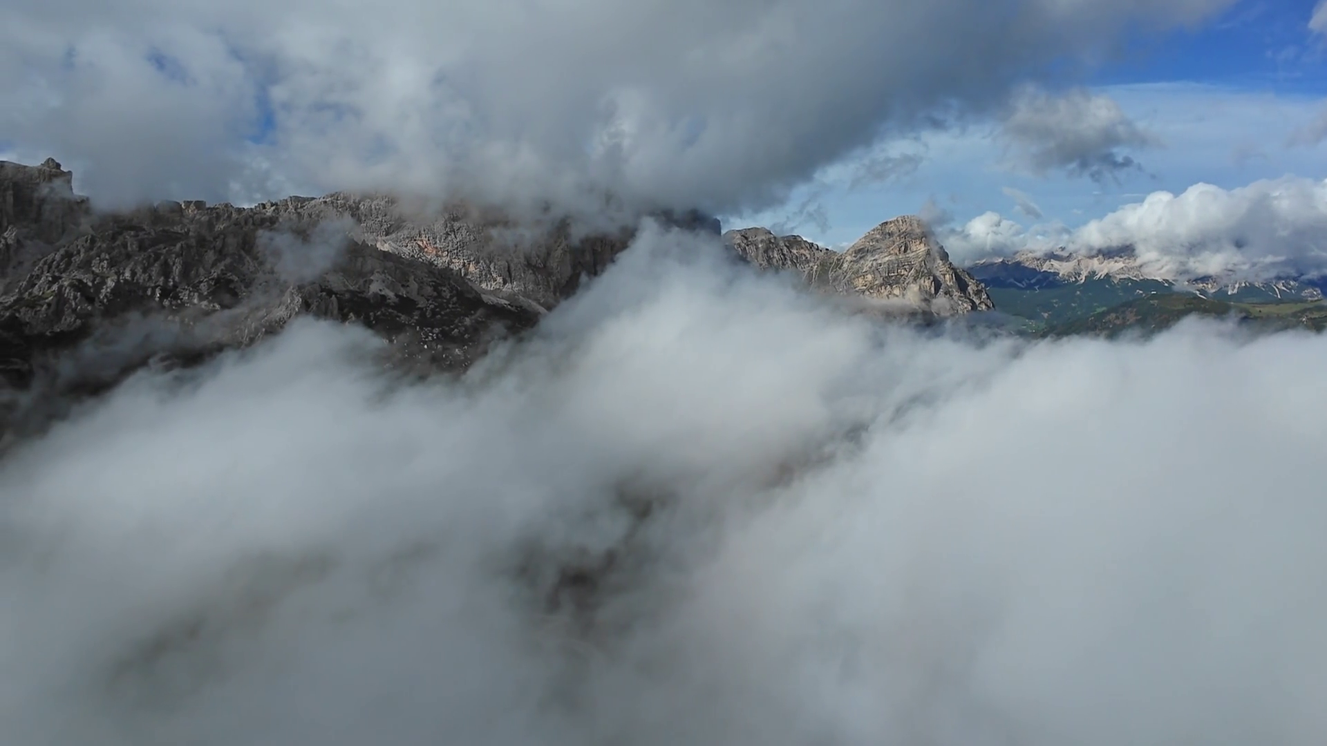 Peaks Piercing Through Thick Cloud Sea Under Dramatic Sky Cinematic Aerial Movement Shows Moody Alpine Valleys And Shifting Weather IdealÂ