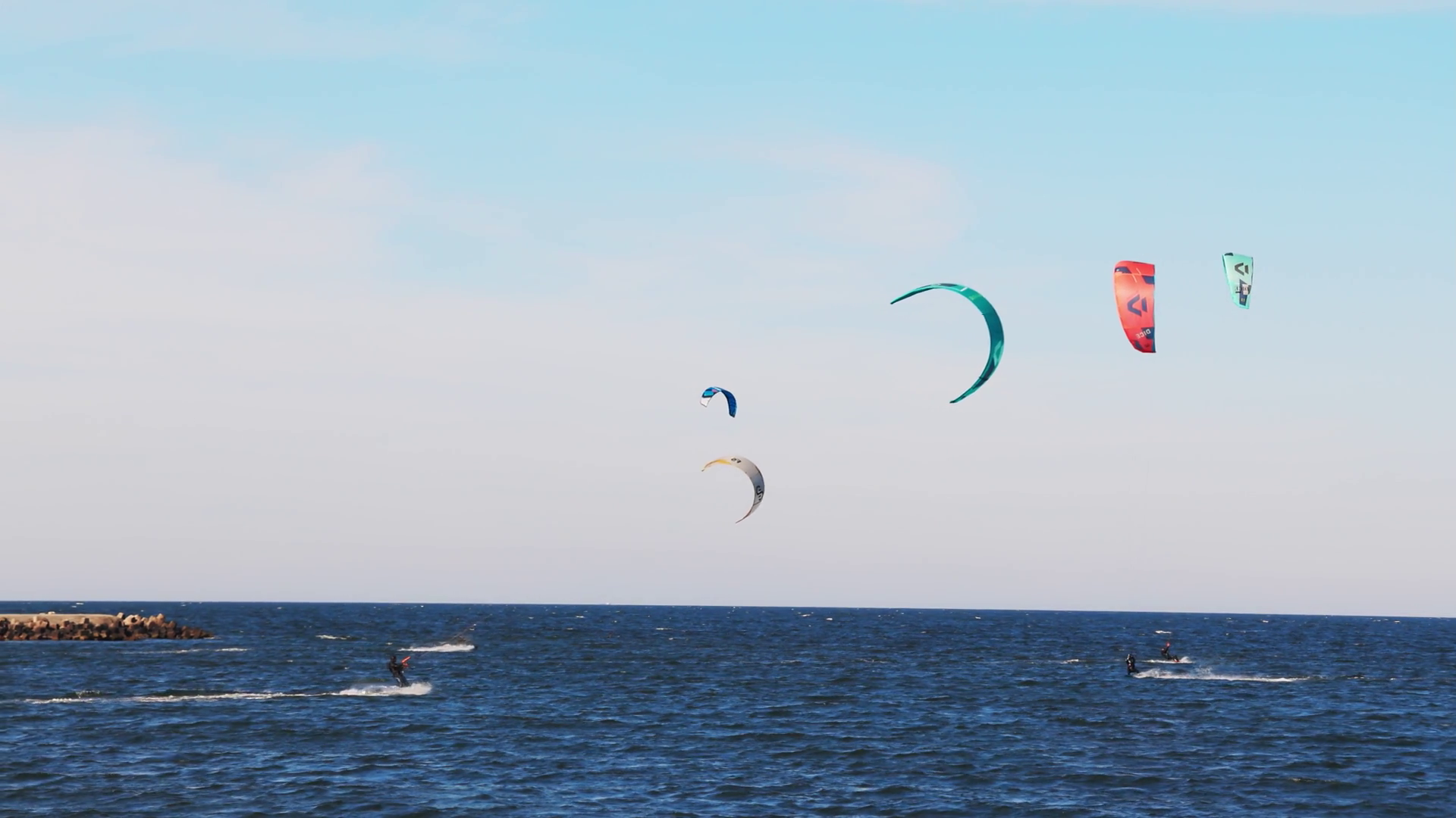 People In Sportswear Go Kiting On The Surface Of The Black Sea Near The Town Of Pomorie Under A Blue SkyÂ