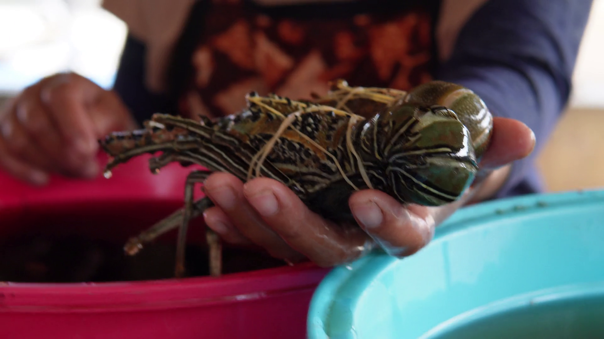 Persons Hand Holding And Presenting Fresh Lobster To Sell In The Fish MarketÂ