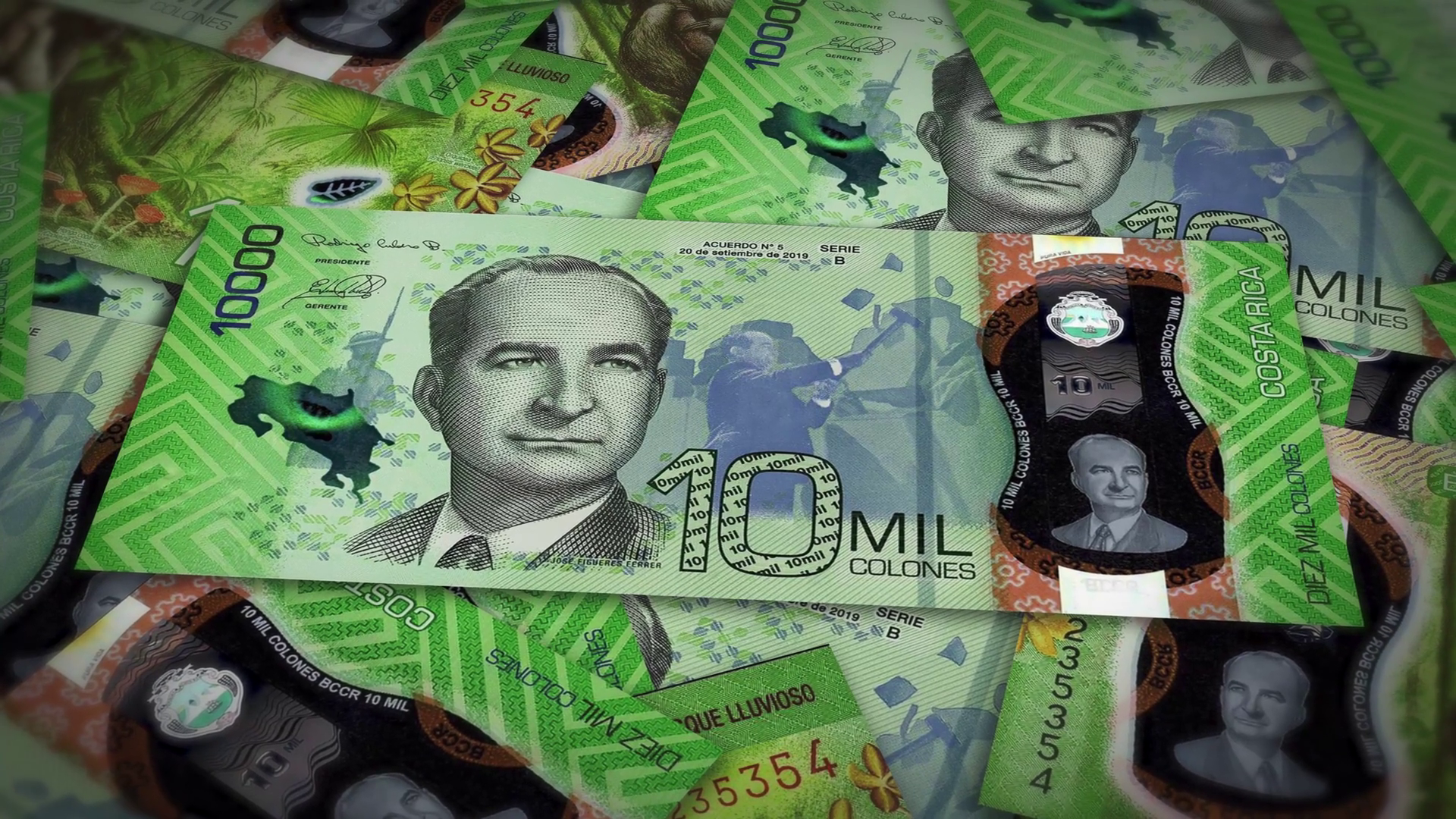 Pile Of Costa Rica Colon Polymer Cash Money Inflation Concept Closeup New Costa Rica Ten Thousand Colon Polymer Bills