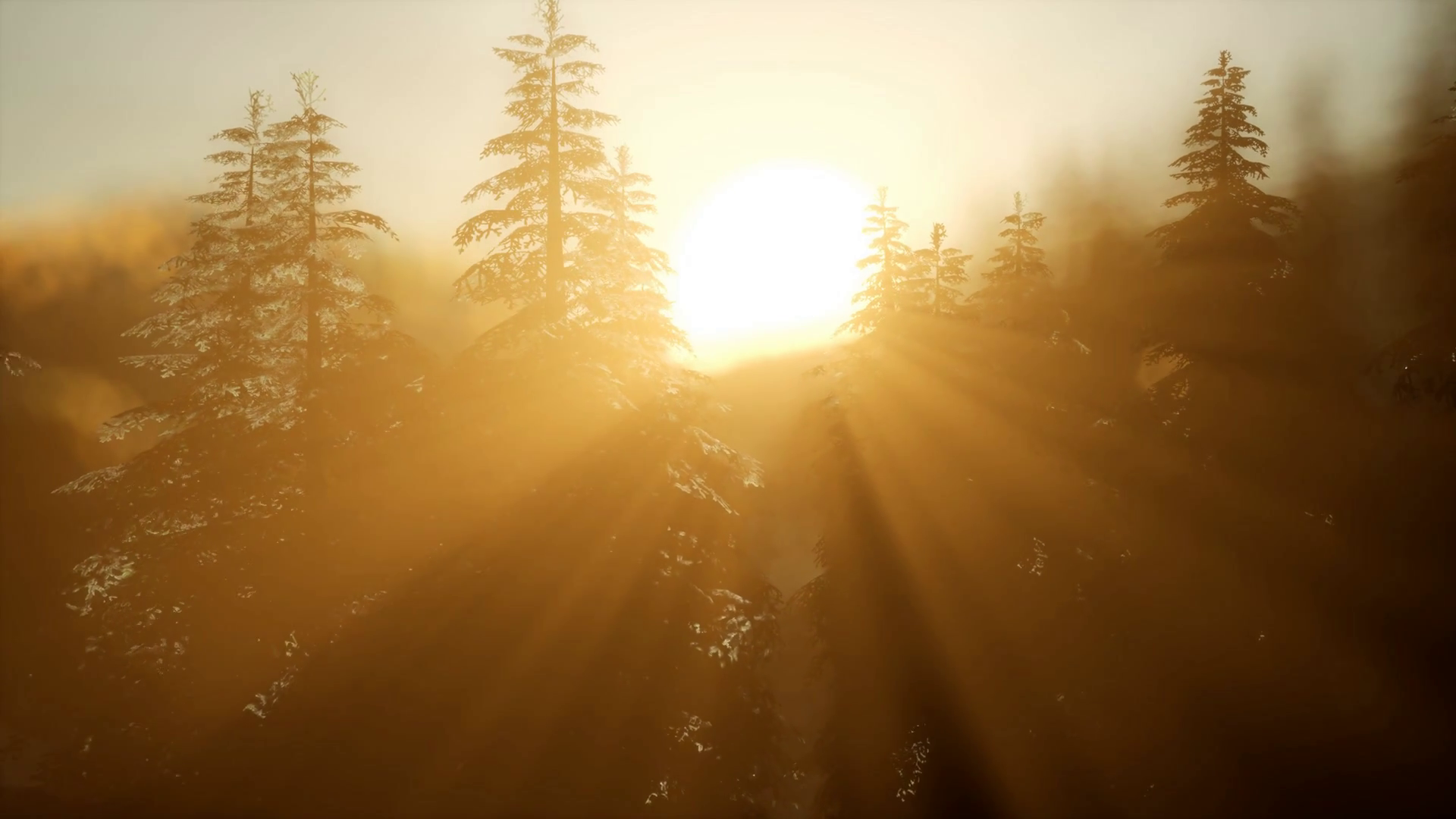 Pine Forest On Sunrise With Warm SunbeamsÂ
