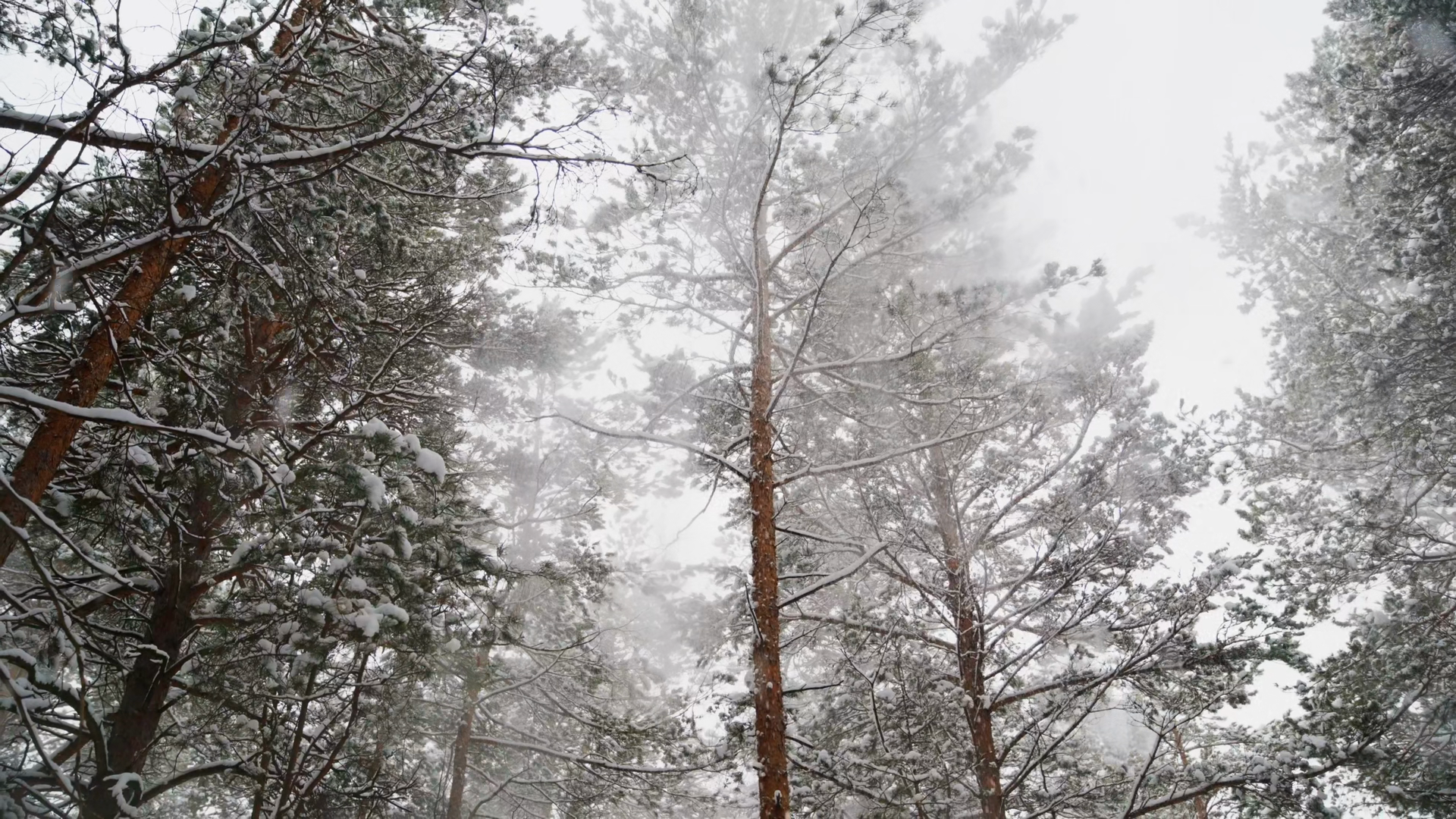 Pine Trees Stand Tall Under Heavy Snow Surrounded By Fog