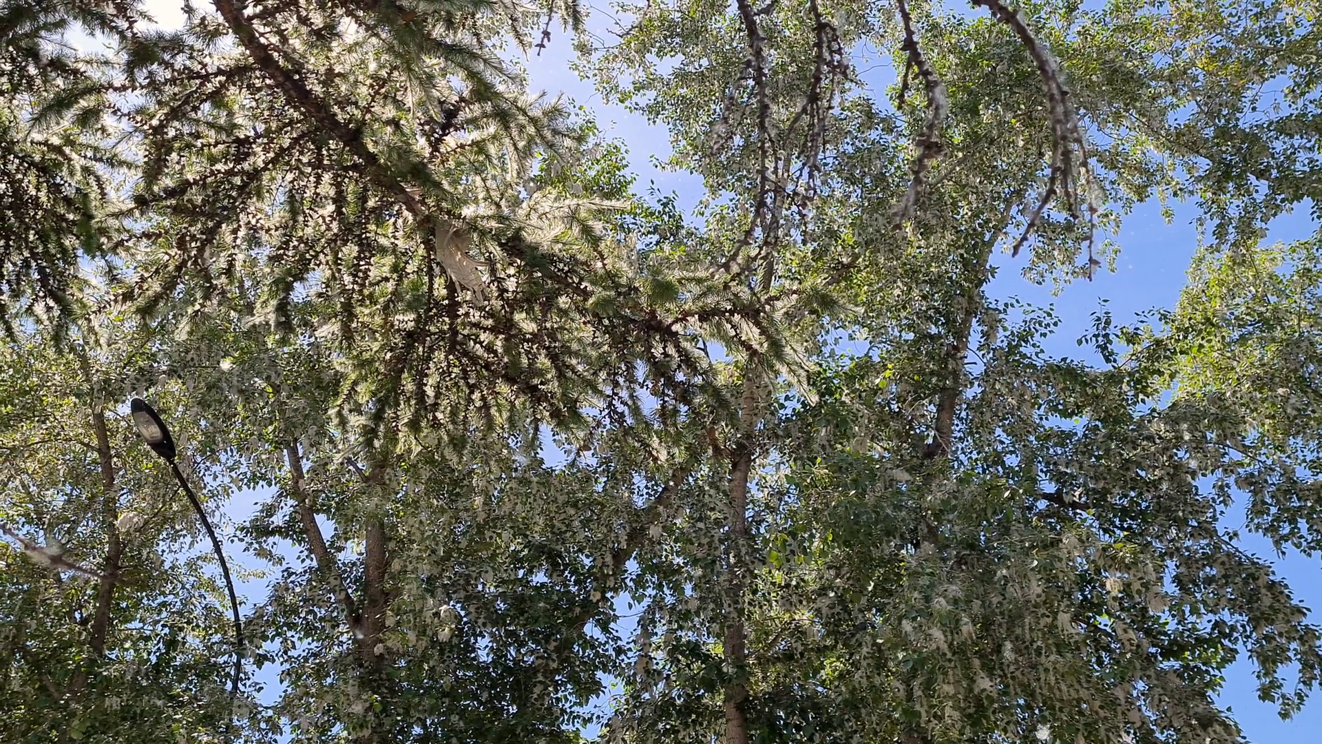 Poplar Fluff With Wind Sunny Day In Public Park Flying White Poplar FluffÂ