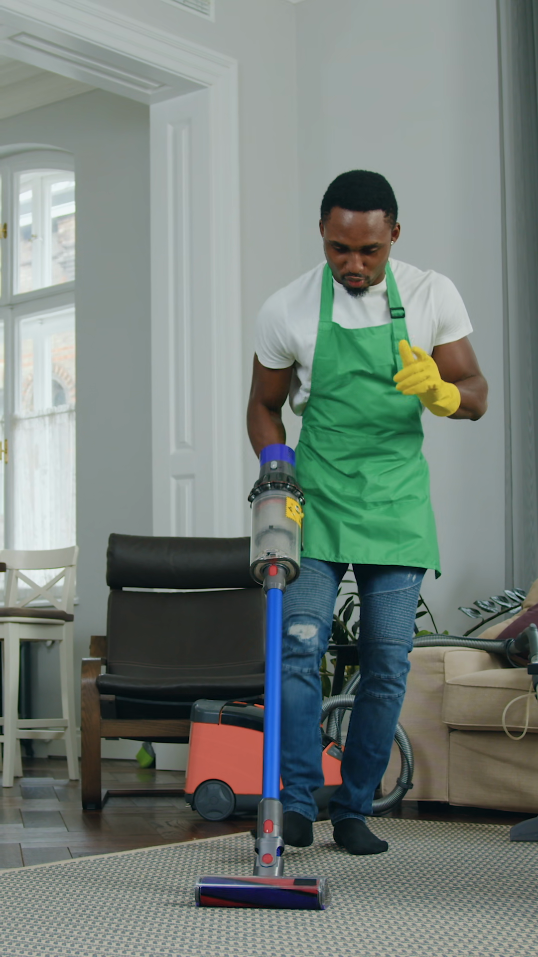 Portrait Of Attractive Cheerful Young African American Cleaner In Uniform Which Vacuuming Carpet In Customer Apartment And Dancing WhileÂ