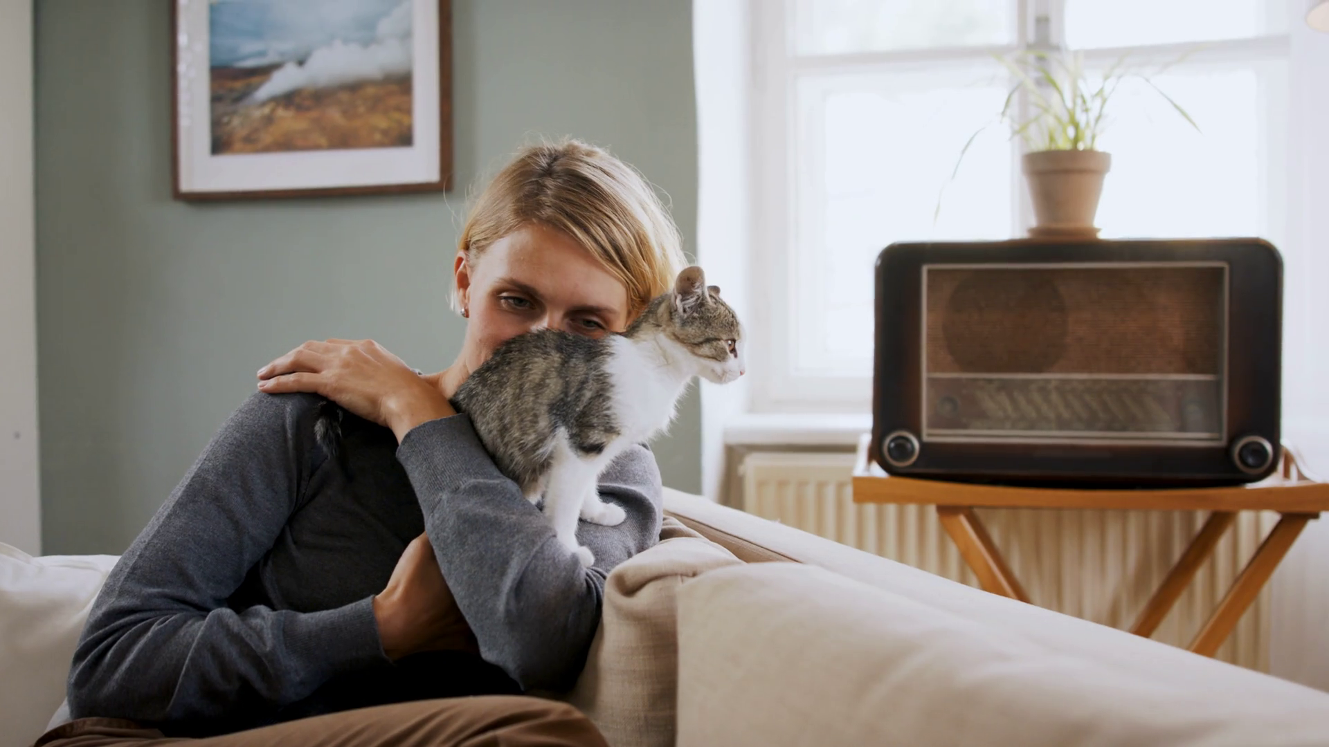 Portrait Of Happy Woman With Cat Relaxing Indoors At Home Mental Health Care ConceptÂ