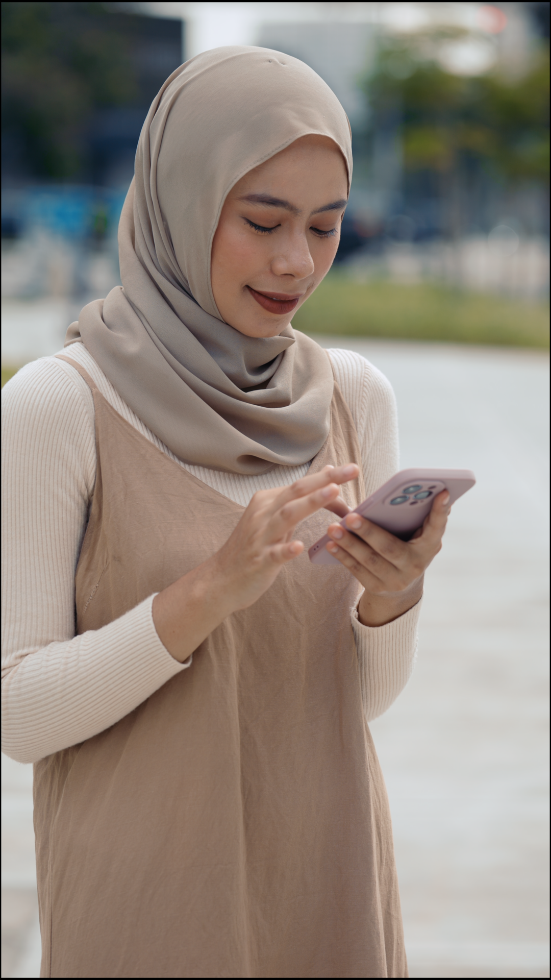 Portrait Of Malaysian Woman Wearing Hijab Smiles Uses Smartphone OutdoorsÂ