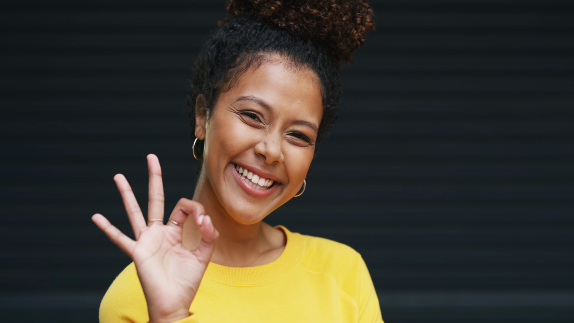 Portrait Smile And Woman With Ok Sign Support And Agreement On A Dark Studio BackgroundÂ