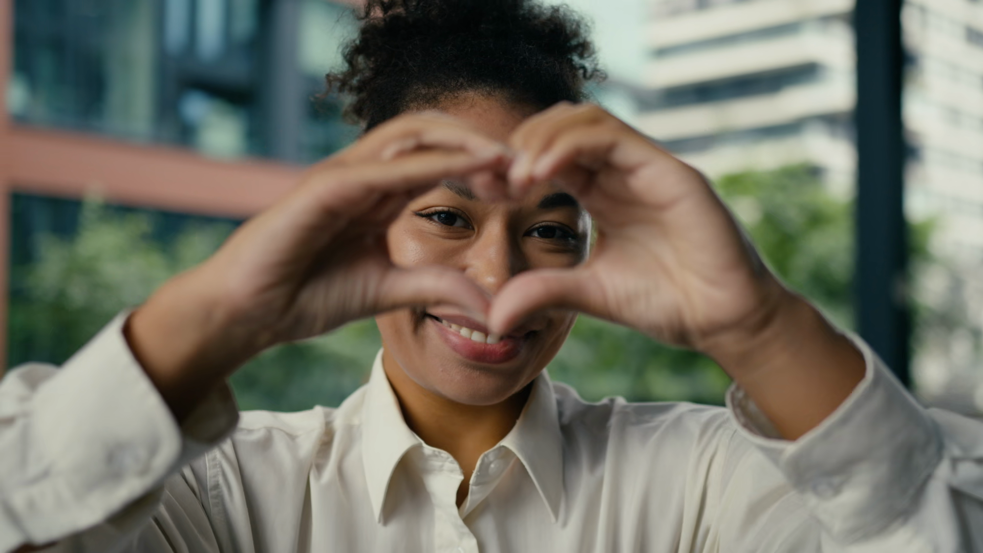 Portrait Smiling African American Business Woman Showing Heart Shape With Hands Smiling Looking At Camera Businesswoman Female GirlÂ