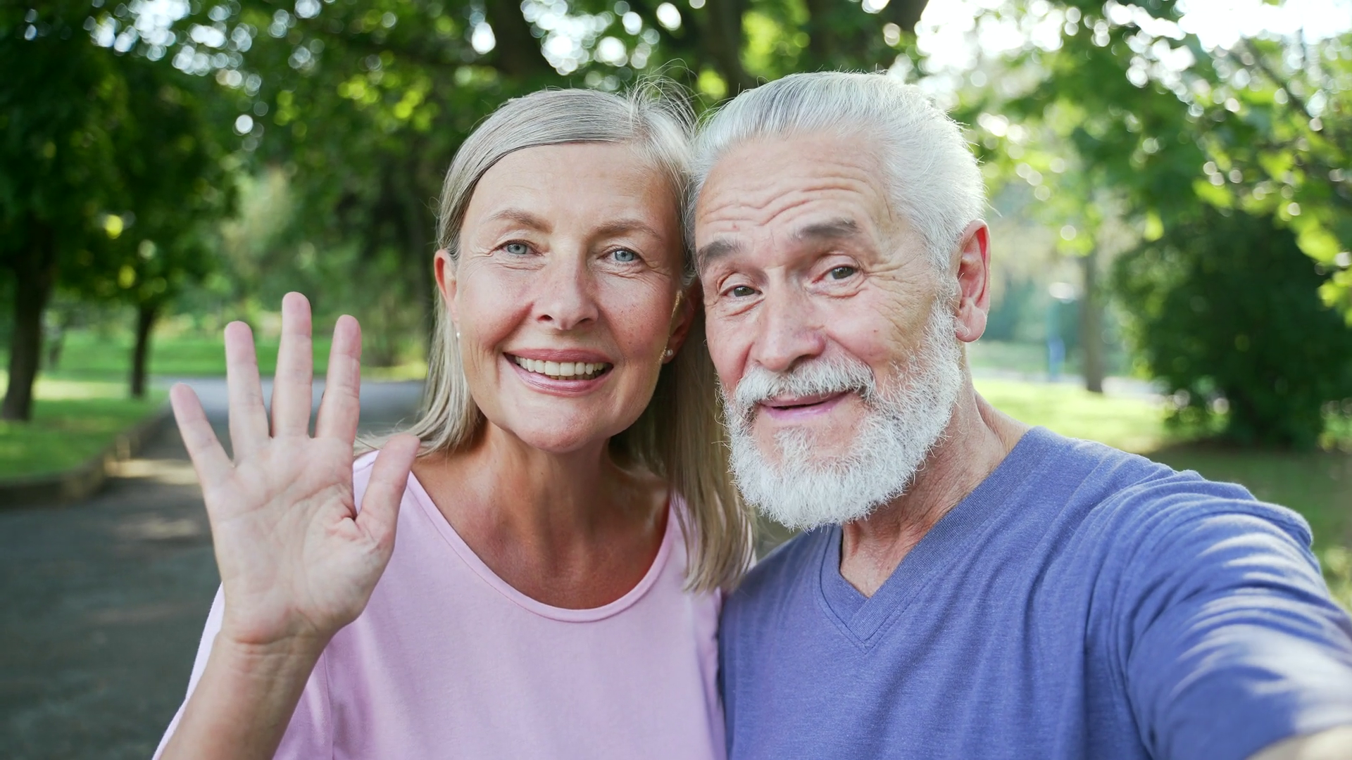 Pov Close Up Married Old Senior Couple Talking On A Video Call Using A Smartphone In An Urban City Park Sporty Mature Gray Haired Retired Wife And Husband Look At The Camera Communicate With FriendÂ