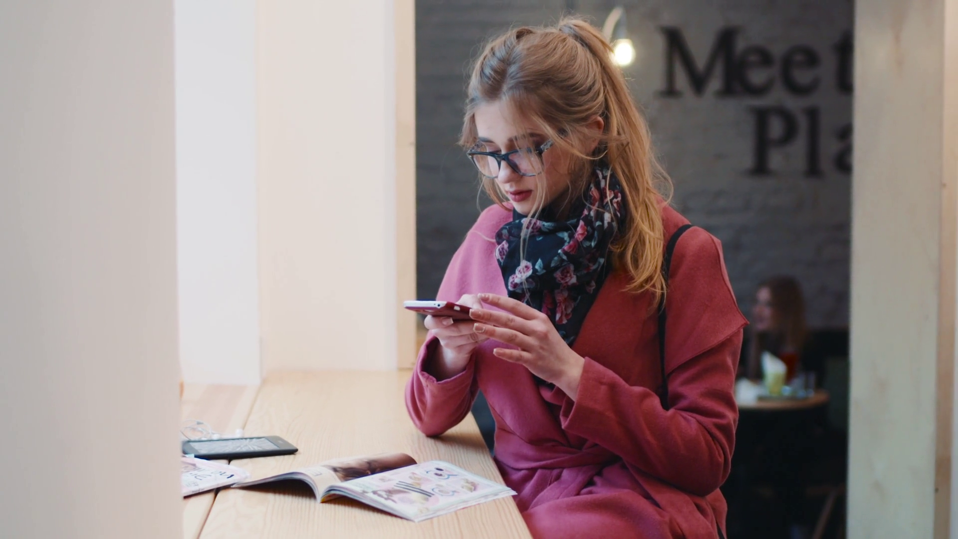 Young Woman Enjoying Time At Cafe Capturing Magazine Moments For Social Media