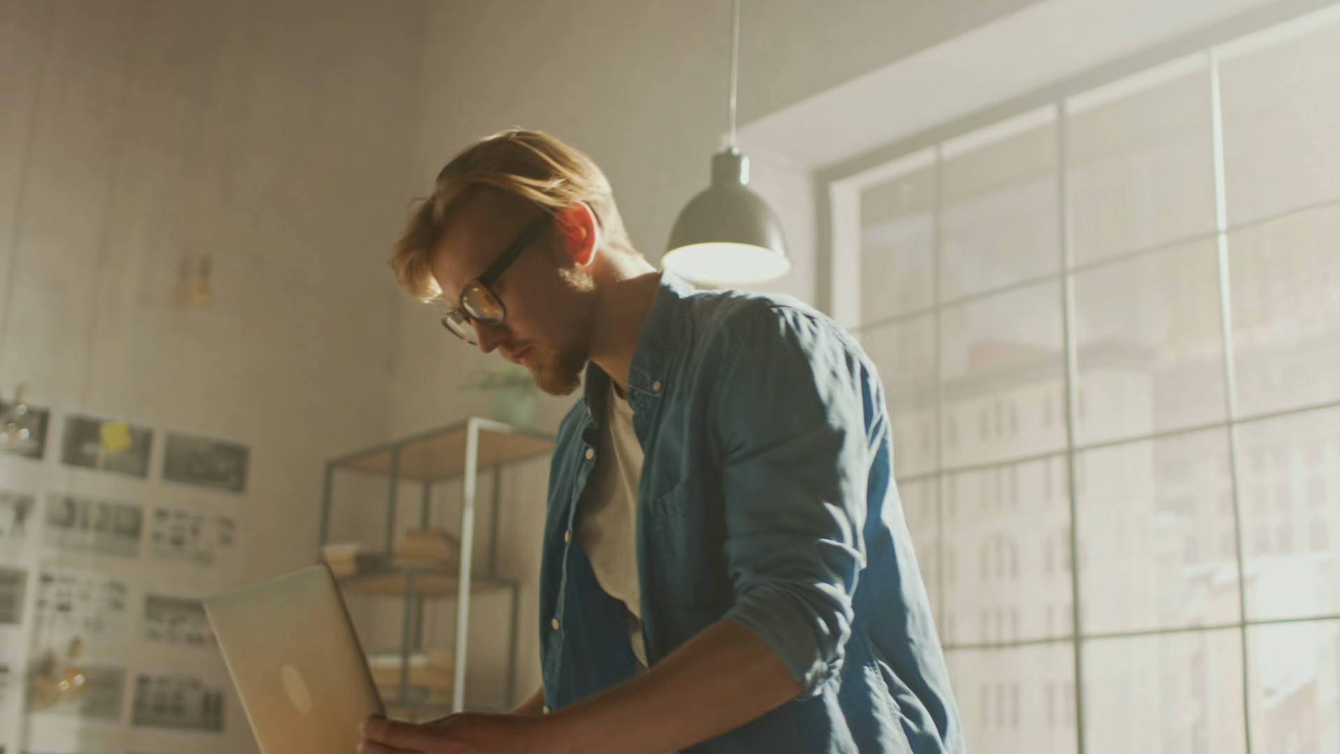 Professional Music Video Editor Holds Laptop While Looking Out Of The Window Onto Big Busy City Seeking Inspiration He Turns Around And Sits At His Desk Working Enthusiastically On His Project