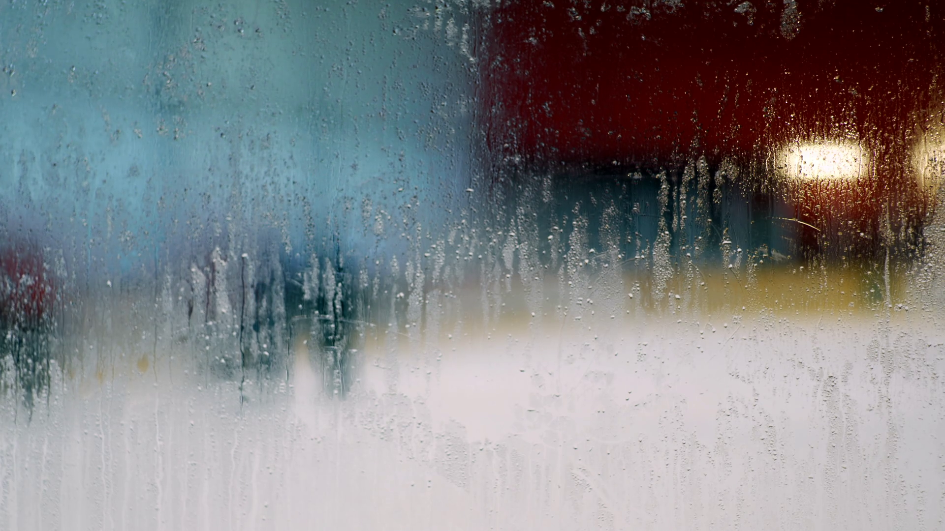 Raindrops On A Glass Window With A Blurred Red And Blue Background Abstract Pattern Of Water Condensation Creating Streaks And Droplets Outoffocus IndoorÂ