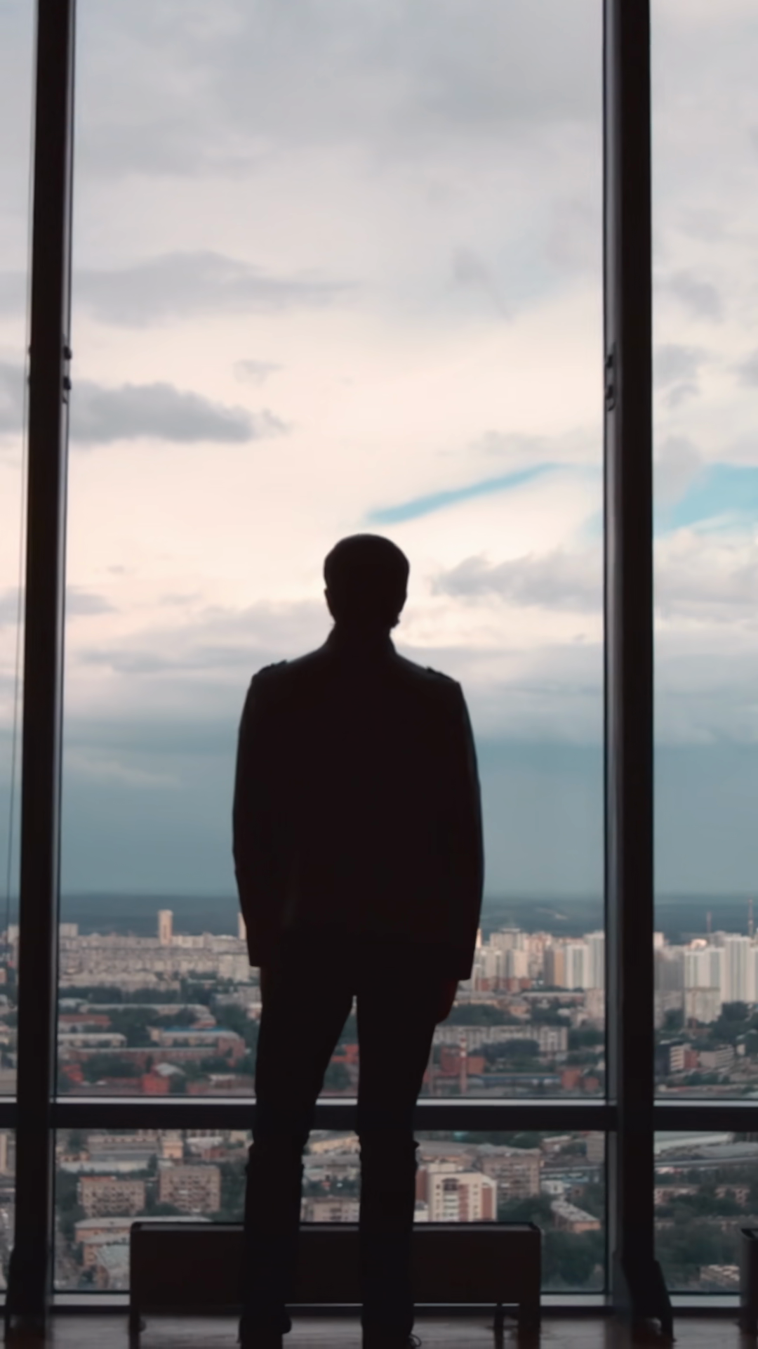 Rear View Of Businessman In An Office With Panoramic City View Businessman Admires The City From The Panoramic Windows In The City CentreÂ