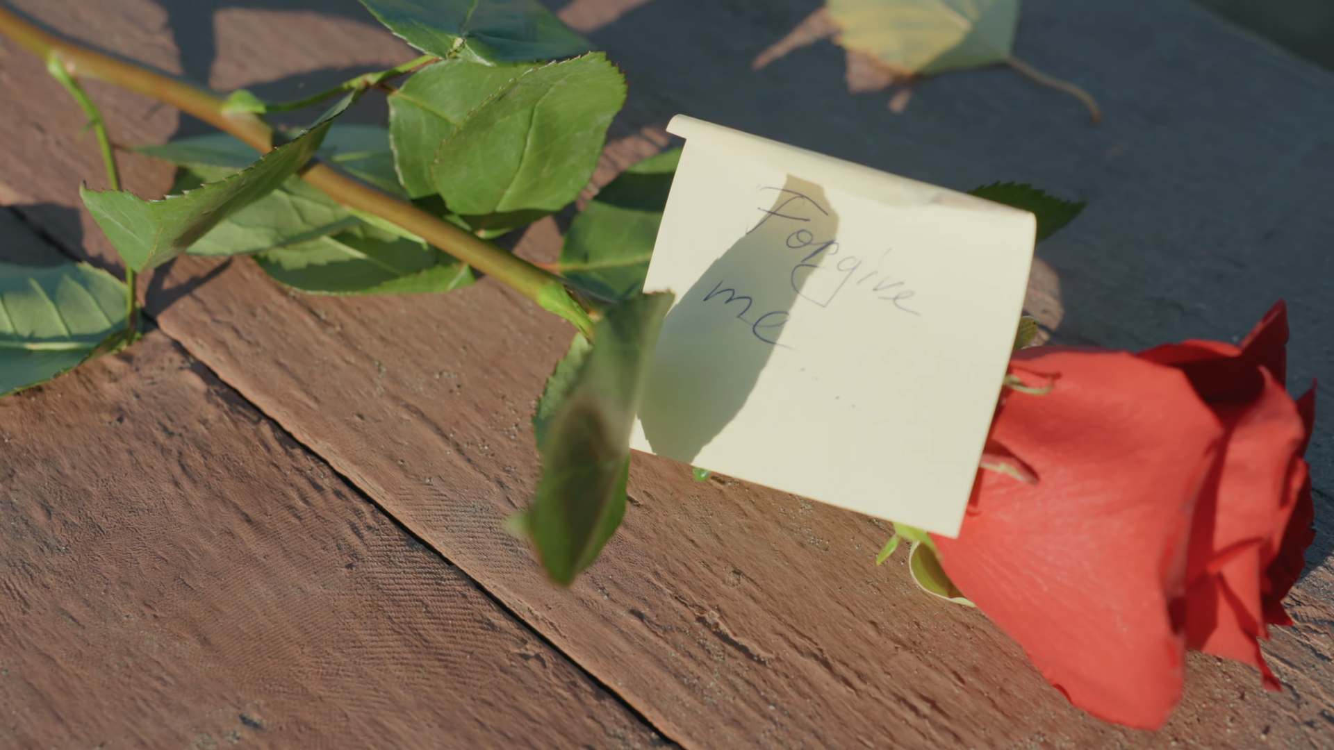 Red Rose On Wooden Bench With Small Folded Sticky Note Casting Soft Shadow Warm Golden Hour Light Illuminates Dewy Petals And Green LeavesÂ