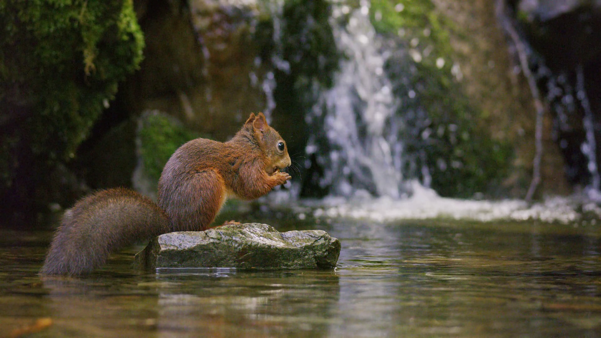 Red Squirrel Jump From A Rock In The Water With A Nut In Mouth Below WaterfallÂ