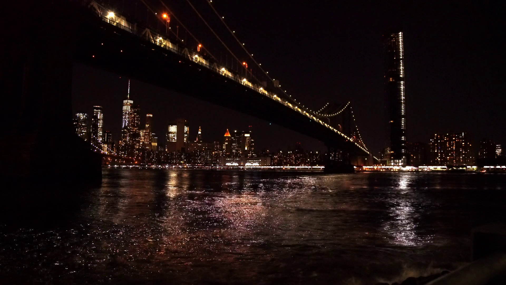 Reflections Sparkle On The East River A View Under Manhattan Bridge At NightÂ
