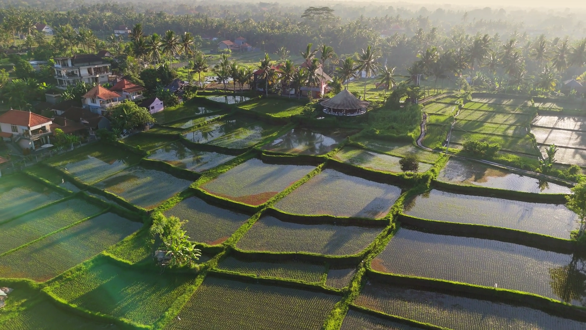 Rice Terraces Filled With Water In Ubud Bali Indonesia Aerial Shot Of Bali Nature Rice Fields And Palms At SunriseÂ