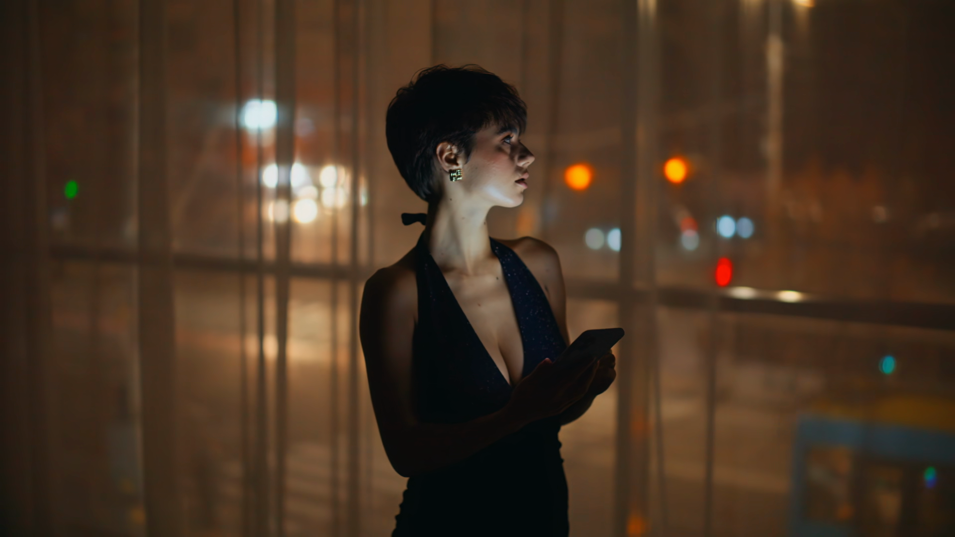 Rich Lady Browsing Smartphone Notification Window Night Apartment Closeup Melancholic Woman Reading Cellphone Message Standing Dark HotelÂ