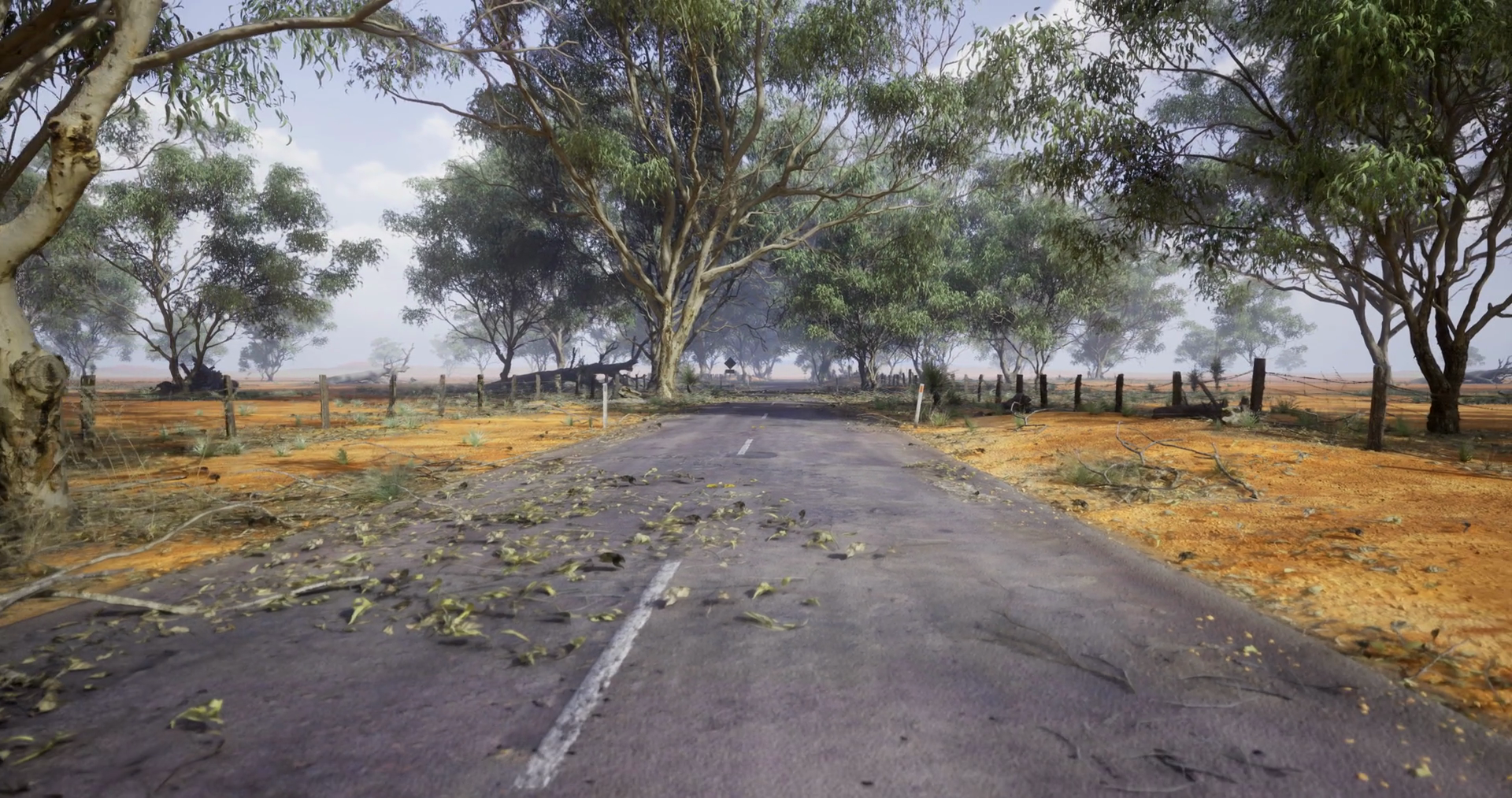 Road Surrounded By Trees And Scattered Debris In A Rural Area After A Storm