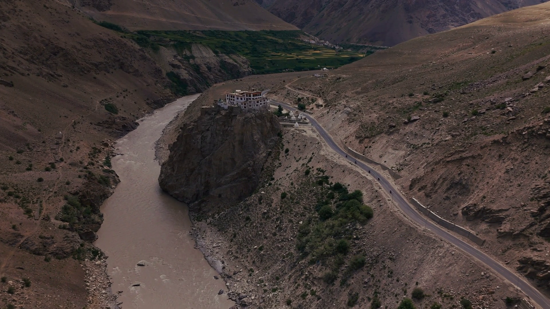 Sacred Buddhist Monastery On Isolated Rock Above Water Drone ViewÂ
